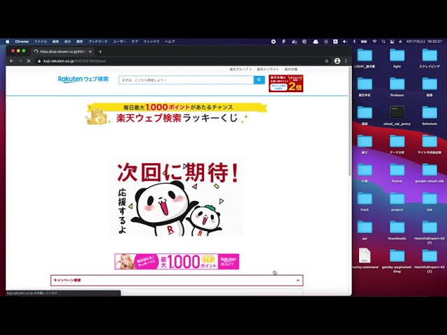 #python #selenium 楽天には「ラッキーくじ」というくじ引きがあります。楽天会員ならば誰でも引けて、毎日1度利用可能です。ただ毎回ページを開いて、くじ引 きするのは大変です。そこで、今回はpython x … 続きを読む »python x seleniumを使って楽天の「ラッキーくじ」を自動化!?