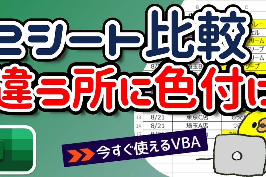 エクセルマクロで、2つのシートを比較し違う箇所に色付けするExcelVBAコードをご紹介します。
