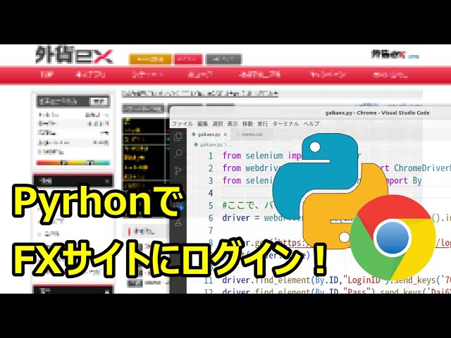 PythonでFXサイトにログインしてみたby admin2023-07-03 Python/Chromedriverを使ってFX(外国為替証拠金取引)サービスのページにログインしてみようと思います。この技術を使っていずれ自動売買できたらいいなと…。 ■Pythonソースコードはこちら■ 【Python】ChromedriverでFXサイトにログインしてみた http://pineplanter.moo.jp/non-it-salaryman/2023/04/18/python-gaikaex/ 関連記事: AIエンジニアが選んだPythonでできること3選 【Python自動化講座②】複数フォルダを一瞬で作成してみよう! #KNIME #自動化 #ノンプログラミング #Python #文系 文系の自動化チャンネル Rule base Row Filtter・Splitter Pythonでサイトに掲載ある大量のリンク先URLを取得する方法|PythonでWebスクレイピング第02回 コメントを残す コメントをキャンセルメールアドレスが公開されることはありません。 ※ が付いている欄は必須項目ですコメント ※ 名前 ※ メール ※ サイト 次回のコメントで使用するためブラウザーに自分の名前、メールアドレス、サイトを保存する。 上に表示された文字を入力してください。 前訳がわからなくても、とにかくChatGPTを使え!非エンジニアでもPythonを学べる時代?【パイソンメイカー】次2023年も開催!完全無料のプログラミング合宿「スパルタキャンプ」AIが得意なPythonも!