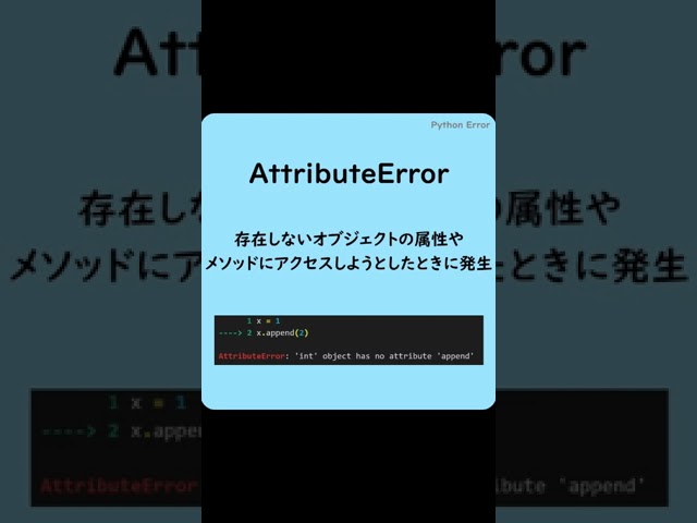 Pythonでよく見るエラー(AttributeError)#shorts #英単語 #プログラミング #python #エラーby admin2024-04-10 関連記事: 見るだけで自然と身につくPythonデータ分析 タスク自動化もAI時代! ビジネスマンでも使えるタスク自動化ツールZapierがChatGPT対応でさらに強力に! 【参加可能】色違いエクスレッグ確定! 無限自動レイド兼レイド交換募集枠【ポケモンsv】 【今日が締切】Pythonでファイナンス分析をイチから学習したい人へ! コメントを残す コメントをキャンセルメールアドレスが公開されることはありません。 ※ が付いている欄は必須項目ですコメント ※ 名前 ※ メール ※ サイト 次回のコメントで使用するためブラウザーに自分の名前、メールアドレス、サイトを保存する。 上に表示された文字を入力してください。 前Excelマクロ→次世代は「Officeスクリプト」でほぼ確定。VBAの勉強はムダになるの?次【Pythonプログラミング入門】便利な文字列メソッドを6つ紹介! 〜VTuberと学習〜 【初心者向け】