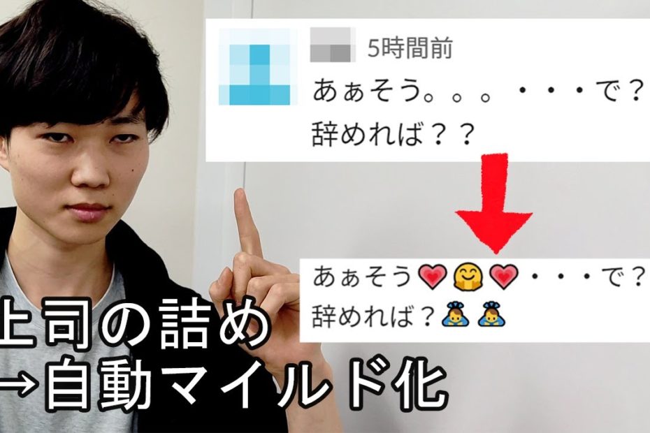 【DIY】仕事で来るギスギス文、自動マイルド化するツールを作ってみたby admin2024-05-06 こんにちは、田中です。 もう一度、生放送をすると以前言ってしまったのですが、日が開いてしまってすみません。 人の期待があると、「勉強しようとしてたときにお母さんに勉強しろと言われる」みたいな気分にならないですか、なんか。 ▼コードをgithubにアップロードしました https://github.com/Tanaka100/emoji_replacer 関連記事: 堀江流!?プログラミング初心者におすすめの勉強方法 Pythonで面倒なExcelの仕事を自動化しよう 合併版|2時間で学べます【Pandas入門講座の次におすすめ】 【完全版】この動画1本でPythonの基礎を習得!忙しい人のための速習コース Pythonで検索自動化?Webスクレイピングを利用して、データ収集を自動化してみた! コメントを残す コメントをキャンセルメールアドレスが公開されることはありません。 ※ が付いている欄は必須項目ですコメント ※ 名前 ※ メール ※ サイト 次回のコメントで使用するためブラウザーに自分の名前、メールアドレス、サイトを保存する。 上に表示された文字を入力してください。 前【完全版】Pythonでできること174例と学習ロードマップを徹底解説!(仕事の自動化、データ分析、機械学習、Webアプリ開発)次PythonでゴミRPAを作ってみた!!