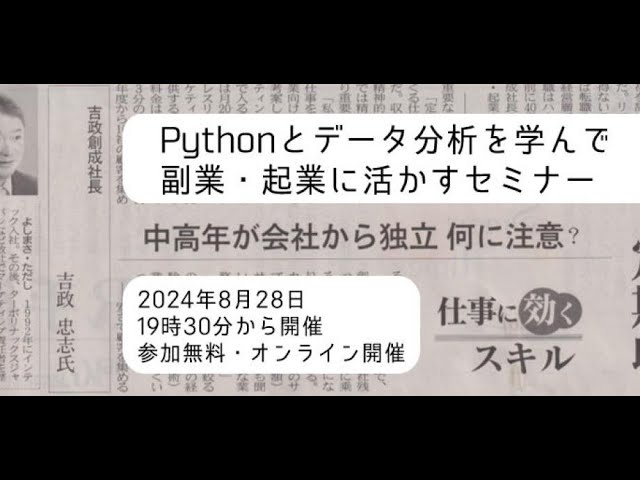 2024年8月に開催した、申し込み330名の人気セミナーの動画です。 セミナー概要は以下の通りです。 開催日時:2024年8月28日19時30分から21時 対象:Pythonやデータ分析を活かした起業・副業に興味がある方… 続きを読む »【申込300名超え】Python/データ分析を学んで副業・起業に活かす方法を考えるセミナー